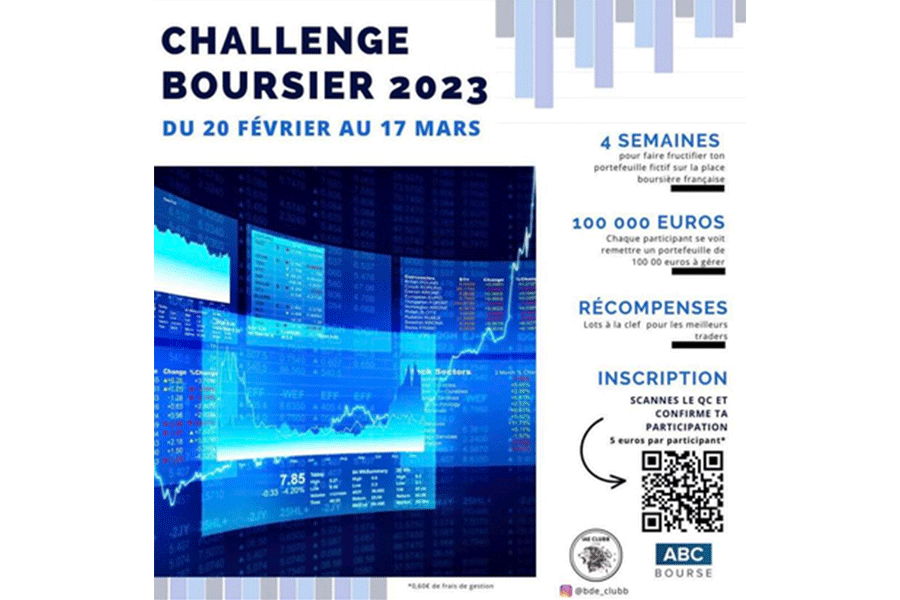Dans le cadre d'un jeu pédagogique, apprenez à faire fructifier un portefeuille fictif de 100 000 euros sur le marché boursier français pendant 4 semaines, du 20 février au 17 mars. Le 21ème Challenge Boursier du Clubb - iaelyon est ouvert à TOUS.